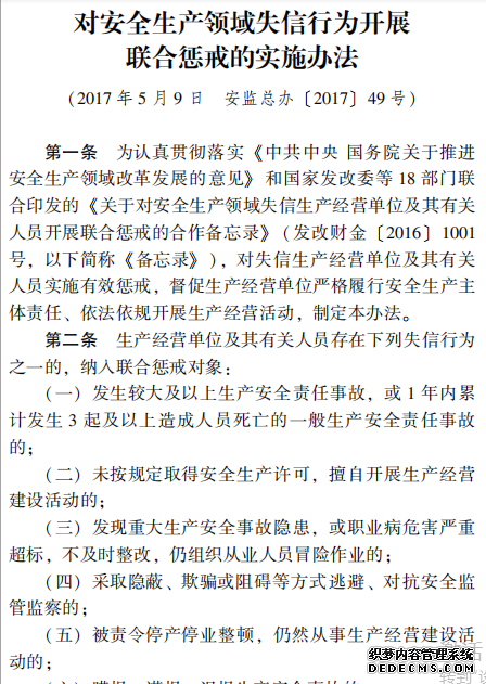 對安全生產領域失信行為開展 聯(lián)合懲戒的實施辦