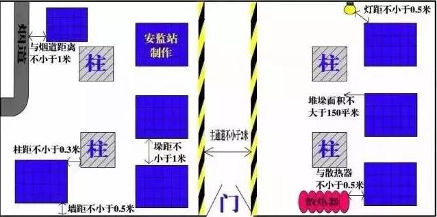 儲存物品與風(fēng)管、供暖管道、散熱器的距離不應(yīng)小于0.5米。與供暖機(jī)組、風(fēng)管爐、煙道之間的距離在各個方向上都不應(yīng)小于1米?!秱}儲場所消防安全管理通則》(GA1131-2014)6.14