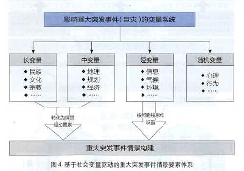 重大突發(fā)事件本身是一個(gè)復(fù)雜系統(tǒng)。當(dāng)嘗試通過“情景構(gòu)建”來表征重大突發(fā)事件的規(guī)律特點(diǎn)時(shí),按照社會(huì)物理學(xué)理論,需要對(duì)一系列社會(huì)變量進(jìn)行描述,決定重大突發(fā)事件情景的變量包含:長(zhǎng)變量(與民族、文化、宗教相關(guān)的變量)、中變量(與地理、規(guī)劃、經(jīng)濟(jì)、社會(huì)相關(guān)的變量)、短變量(與信息、氣候、環(huán)境、交通等相關(guān)的變量)、隨機(jī)變量(與心理、行為以及未知因素相關(guān)的變量)(見圖4)。為確保重大突發(fā)事件情景能夠準(zhǔn)確地代表不斷演化的國家風(fēng)險(xiǎn)(或者地區(qū)風(fēng)險(xiǎn)),情景構(gòu)建過程中,需將上面所述的長(zhǎng)變量與中變量設(shè)置為情景恒定要素,當(dāng)這兩類變量發(fā)生變動(dòng)時(shí),需要及時(shí)修訂情景;此外,關(guān)于短變量,應(yīng)該基于“底線思維”,設(shè)置可能導(dǎo)致事件往最壞方向發(fā)展的變量,這樣可以有效保證與情景所匹配的目標(biāo)能力具備“冗余”。而隨機(jī)變量,對(duì)于情景構(gòu)建來說不具備較大價(jià)值,不應(yīng)該在情景中描述。