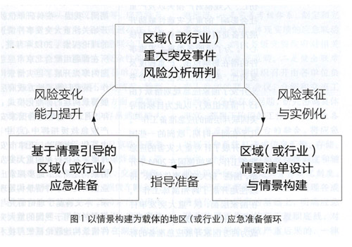 情景構(gòu)建是一個(gè)地區(qū)(或行業(yè))的戰(zhàn)略風(fēng)險(xiǎn)管理工具,在地區(qū)(或行業(yè))的重大突發(fā)事件風(fēng)險(xiǎn)研判基礎(chǔ)上,可以確定地區(qū)(或行業(yè))情景清單并且對(duì)每項(xiàng)典型風(fēng)險(xiǎn)開展情景構(gòu)建,對(duì)典型風(fēng)險(xiǎn)進(jìn)行實(shí)例化表征;在情景構(gòu)建結(jié)束后,一系列情景可以引導(dǎo)地區(qū)(或行業(yè))有的放矢開展應(yīng)急準(zhǔn)備行動(dòng),指導(dǎo)應(yīng)急能力的提升;伴隨著風(fēng)險(xiǎn)環(huán)境的變化、應(yīng)急能力的提高,在風(fēng)險(xiǎn)研判基礎(chǔ)上,可以將情景清單進(jìn)行動(dòng)態(tài)調(diào)整、或者對(duì)某項(xiàng)(不符合當(dāng)下風(fēng)險(xiǎn)的)情景進(jìn)行修訂。如此,可以形成一個(gè)以“情景構(gòu)建”為載體的應(yīng)急準(zhǔn)備循環(huán),如圖1所示。