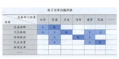 基于情景應(yīng)對(duì)的任務(wù)清單逐步清晰以后,可以通過業(yè)務(wù)部門的座談分析,明確各項(xiàng)任務(wù)的歸屬,得出表2所示的任務(wù)歸屬列表(R表示負(fù)責(zé)、S表示支持)。實(shí)踐表明,該項(xiàng)工作將會(huì)有效查漏補(bǔ)缺,優(yōu)化既有應(yīng)急機(jī)制,彌補(bǔ)體制上的條塊分割與碎片化問題。