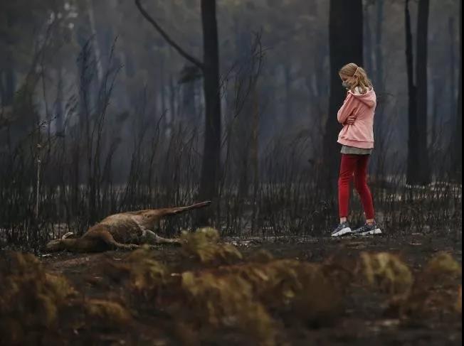 小女孩憂傷地望著被山火毀滅的生靈