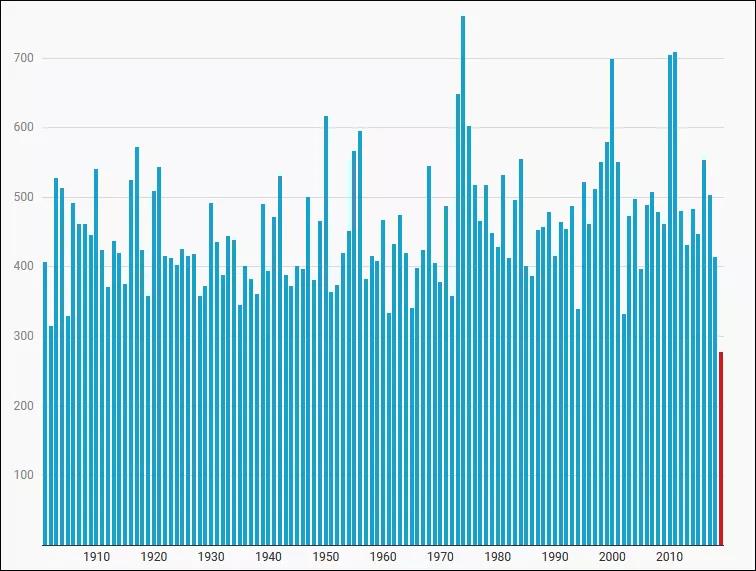 澳大利亞1900年-2019年降水情況,紅色為2019年降水情況 圖片來源:俠客島