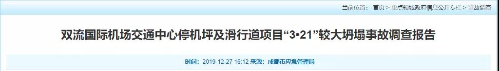 經(jīng)調(diào)查認(rèn)定,雙流國際機(jī)場交通中心停機(jī)坪及滑行道項目“3·21”坍塌事故是一起生產(chǎn)安全責(zé)任事故,事故等級為較大事故。