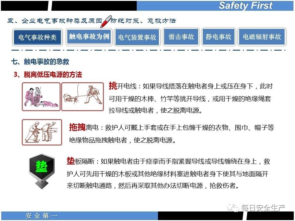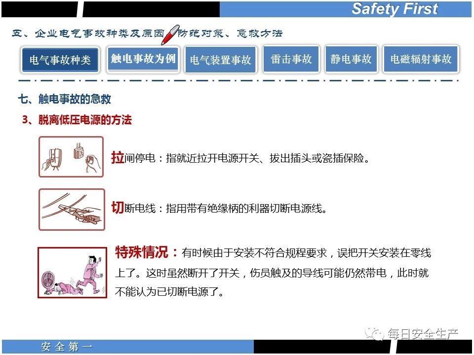 如果是低壓電源觸電,實(shí)施“五字”脫離電源法: