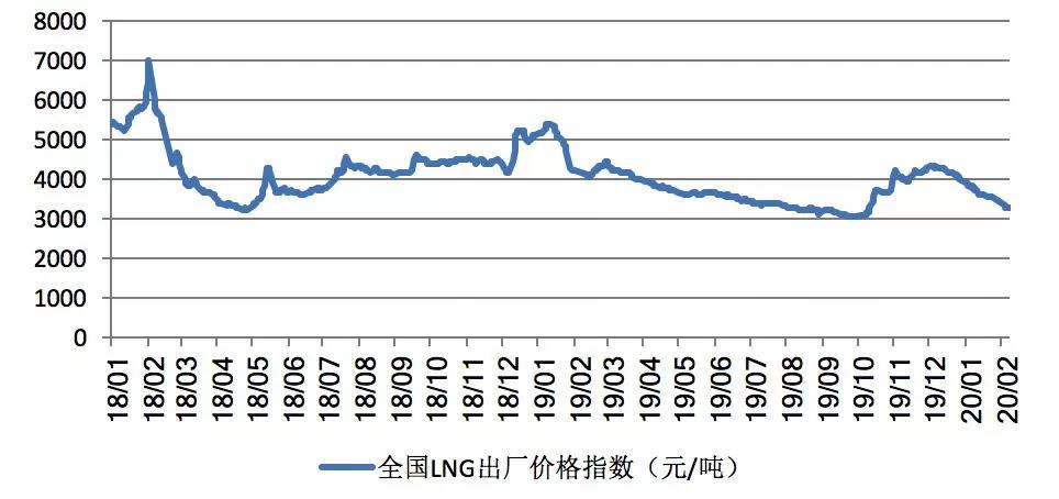 國內(nèi)LNG需求的低迷導(dǎo)致其價(jià)格也承壓下行。根據(jù)上海石油天然氣交易中心發(fā)布的全國LNG出廠價(jià)格指數(shù)測(cè)算,2月7日,全國LNG出廠價(jià)為3277元/噸,與去年同期高于4000元/噸的價(jià)格水平下跌18%,較2019年12月31日的3929元/噸的價(jià)格水平下跌652元/噸,跌幅為16.6%。