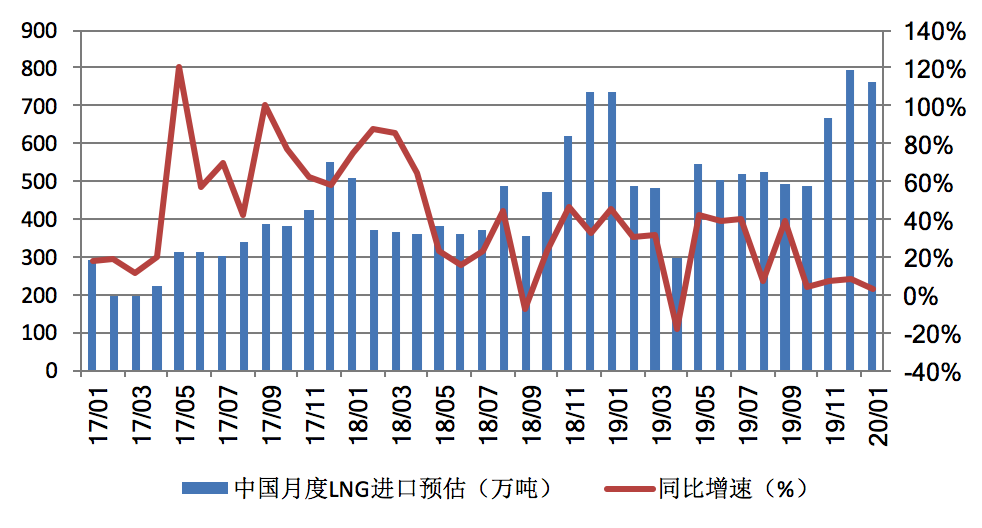 新華能源E-gas數(shù)據(jù)平臺(tái)的預(yù)測(cè)結(jié)果顯示,2020年1月份,中國LNG進(jìn)口量預(yù)計(jì)為763萬噸,較去年同期增長3.4%,較2019年12月減少3.9%。