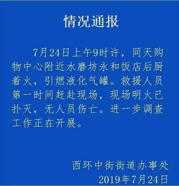 7月24日上午9時(shí)許,同天購(gòu)物中心附近水磨坊永和飯店后廚著火,引燃液化氣罐。救援人員第一時(shí)間趕赴現(xiàn)場(chǎng),現(xiàn)場(chǎng)明火已撲滅,無(wú)人員傷亡。進(jìn)一步調(diào)查工作正在開(kāi)展。
