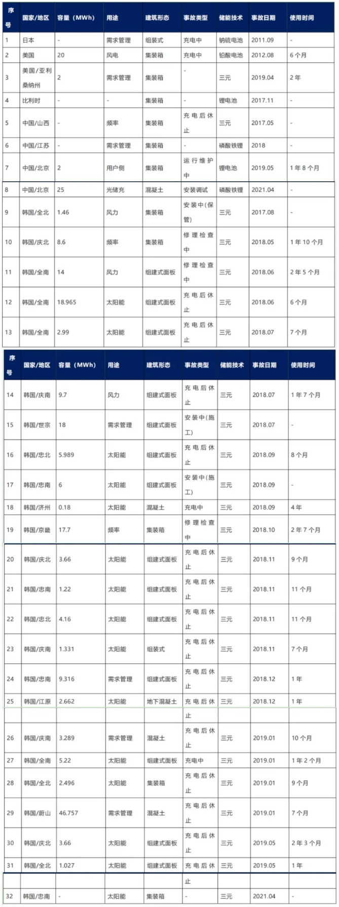 近10年間,全球共發(fā)生32起儲(chǔ)能電站起火爆炸事故。其中,日本1起、美國2起、比利時(shí)1起、中國3起、韓國24起。通過對(duì)行業(yè)公開信息進(jìn)行搜集整理,匯總了2011-2021年間,全球儲(chǔ)能項(xiàng)目主要火災(zāi)或爆炸事故。由于較多安全事故原因復(fù)雜,相關(guān)事件很多都未公開披露。