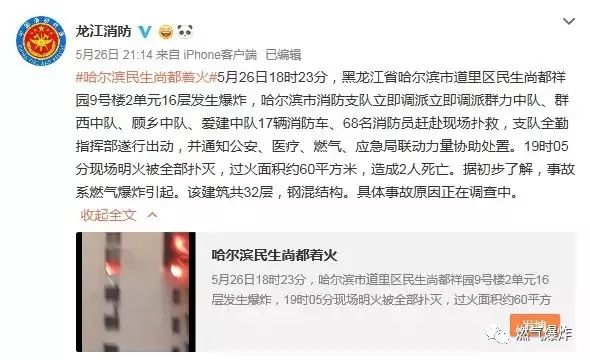 據(jù)@龍江消防:#哈爾濱民生尚都著火#5月26日18時(shí)23分,黑龍江省哈爾濱市道里區(qū)民生尚都祥園9號(hào)樓2單元16層發(fā)生爆炸,哈爾濱市消防支隊(duì)立即調(diào)派立即調(diào)派群力中隊(duì)、群西中隊(duì)、顧?quán)l(xiāng)中隊(duì)、愛建中隊(duì)17輛消防車、68名消防員趕赴現(xiàn)場(chǎng)撲救,支隊(duì)全勤指揮部遂行出動(dòng),并通知公安、醫(yī)療、燃?xì)?、?yīng)急局聯(lián)動(dòng)力量協(xié)助處置。19時(shí)05分現(xiàn)場(chǎng)明火被全部撲滅,過火面積約60平方米,造成2人死亡。據(jù)初步了解,事故系燃?xì)獗ㄒ?。該建筑?2層,鋼混結(jié)構(gòu)。