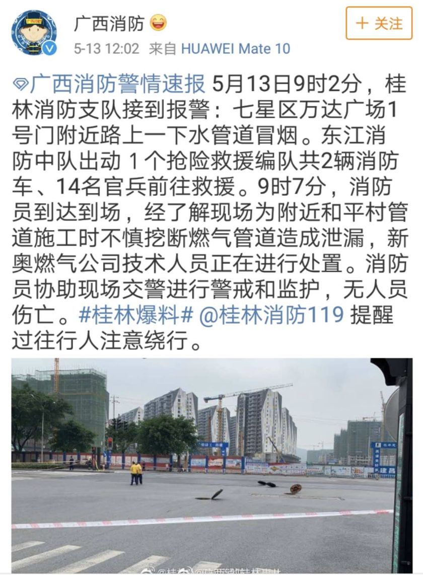 中午12時,@廣西消防官微發(fā)布了一警情速報:5月13日9時2分,桂林消防支隊接到報警:七星區(qū)萬達廣場1號門附近路上一下水管道冒煙。9時7分,消防員到達到場,經(jīng)了解現(xiàn)場為附近和平村管道施工時不慎挖斷燃氣管道造成泄漏,新奧燃氣公司技術(shù)人員正在進行處置。消防員協(xié)助現(xiàn)場交警進行警戒和監(jiān)護,無人員傷亡。