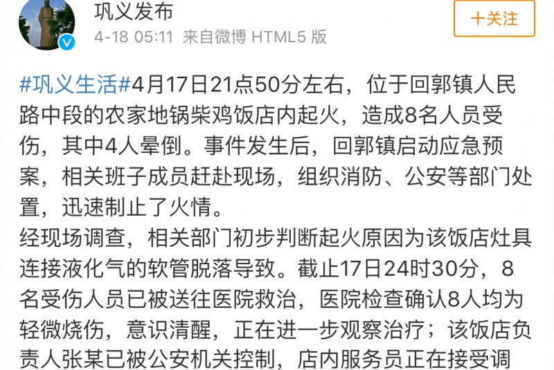 “鞏義發(fā)布”稱:4月17日21時(shí)50分左右,位于回郭鎮(zhèn)人民路中段的農(nóng)家地鍋柴雞飯店內(nèi)起火,造成8名人員受傷,其中4人暈倒。事件發(fā)生后,回郭鎮(zhèn)啟動(dòng)應(yīng)急預(yù)案,相關(guān)班子成員趕赴現(xiàn)場,組織消防、公安、等部門處置,迅速制止了火情。