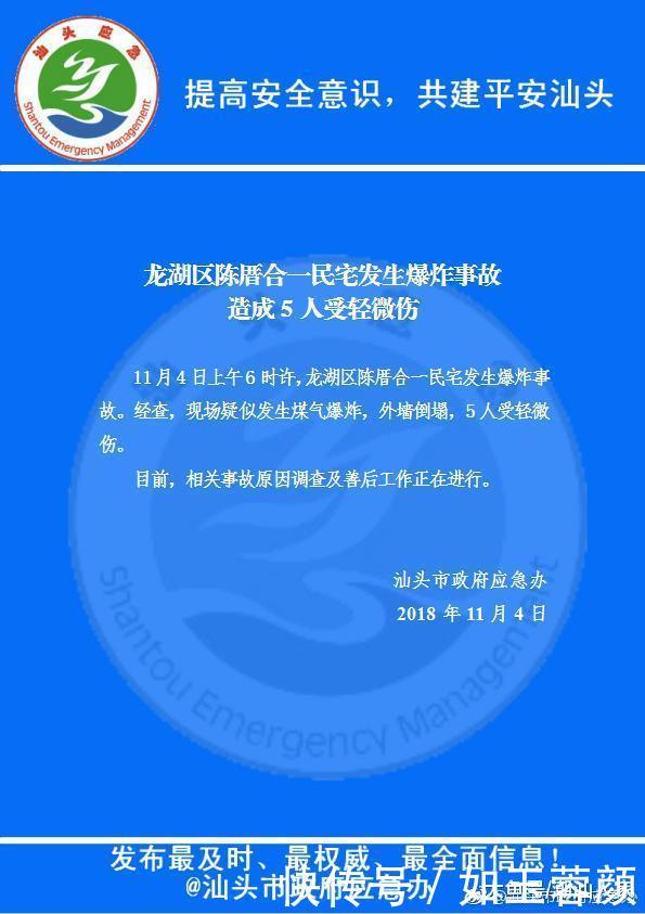 據(jù)“汕頭市政府應(yīng)急辦”發(fā)布通報(bào)稱:2018年11月4日上午6時(shí)許,汕頭龍湖區(qū)陳厝合一民宅發(fā)生爆炸事故。經(jīng)查,現(xiàn)場疑似發(fā)生煤氣爆炸,外墻倒塌,5人受輕微傷。目前,相關(guān)事故原因調(diào)查及善后工作正在進(jìn)行。
