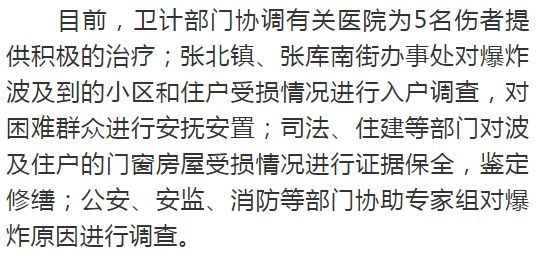 經(jīng)初步調(diào)查:此次事件疑似為天然氣泄漏遇明火發(fā)生爆炸,12號(hào)樓1單元共11戶,5人受傷,傷者均為302室,現(xiàn)分別在張家口和北京的醫(yī)院接受治療。目前均無生命危險(xiǎn),傷者和家屬情緒穩(wěn)定。