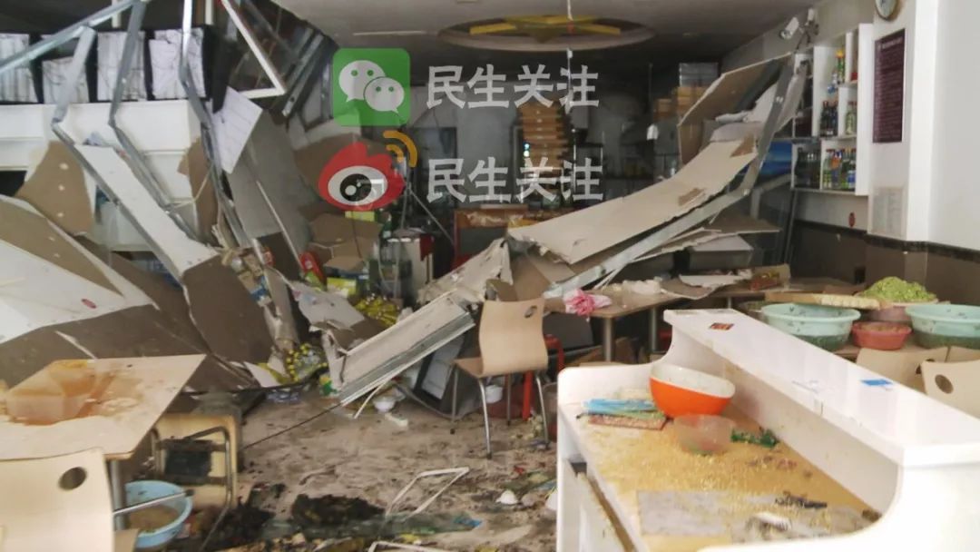 由于爆炸沖擊力過大,把緊鄰旁邊的過橋米線館北側(cè)墻崩倒,門口兩扇門玻璃被震碎。幸好當時飯店里人都及時跑了出來,沒有人員傷亡。