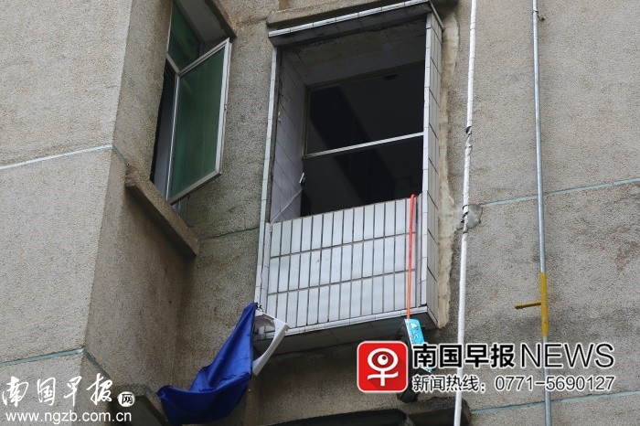 ▲爐灶因燃爆飛出窗戶,掛在窗臺(tái)上。 南國早報(bào)記者 鄒財(cái)麟攝