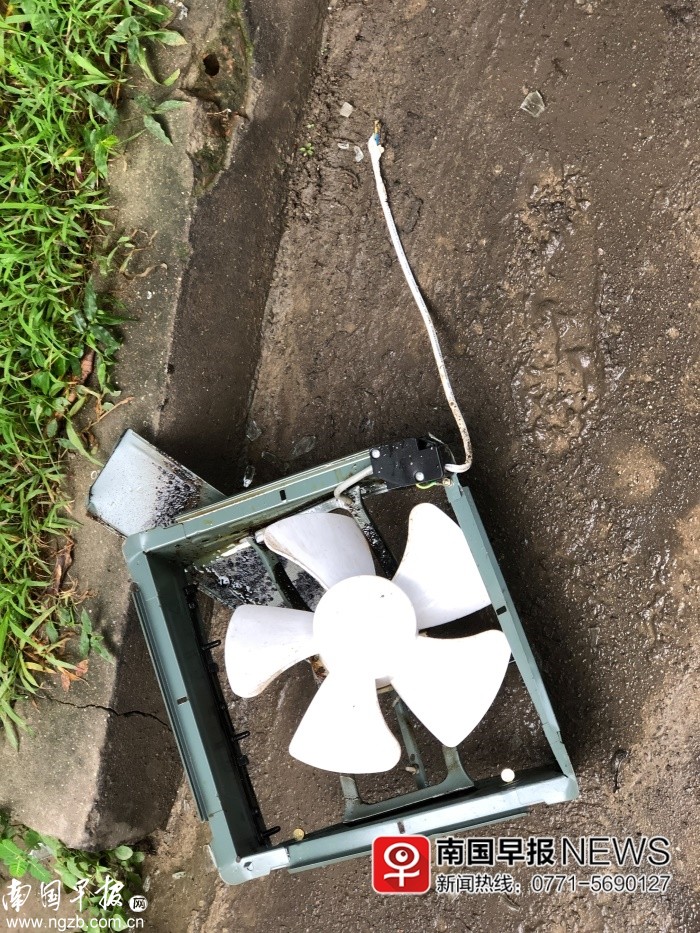 ▲被炸飛掉落樓下地面的排風(fēng)扇。
