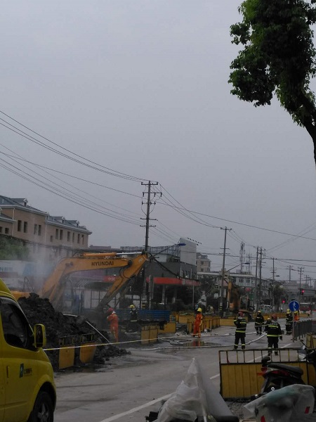 據(jù)附近市民介紹,近期,國權(quán)北路正在進(jìn)行道路施工。昨天下午,一臺挖掘機(jī)在作業(yè)時,不慎將地下一根燃?xì)夤艿劳跀?,頓時,大量氣體從管道內(nèi)噴出,空氣中還彌漫著一股濃烈的煤氣味。目擊者稱,管道被挖破后,現(xiàn)場噴出白色氣體,并不斷發(fā)出“嗤嗤”的聲音,工人們見狀,趕緊將挖掘機(jī)熄火。