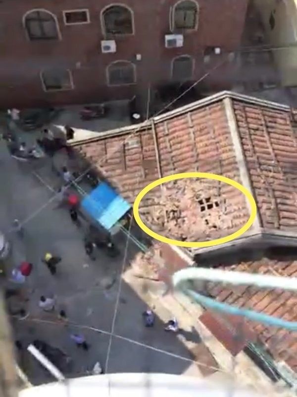 現(xiàn)場(chǎng)可以看到,該棟民宅的屋頂有四分之一的瓦片被毀,從隔壁的樓上往下看時(shí),可以看見(jiàn)屋頂已經(jīng)出現(xiàn)一個(gè)大洞。