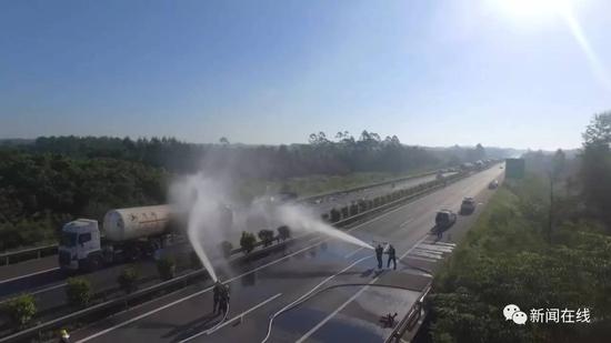將近20噸的天然氣一旦發(fā)生爆炸后果將不堪設(shè)想,消防官兵立即組織將現(xiàn)場群眾疏散至2公里以外,同時交警部門對高速路雙向管制,嚴(yán)禁任何車輛和人員接近。這場大火一直燒到了上午7點(diǎn)才漸漸停止,這時貨車已經(jīng)燒成廢鐵,天然氣罐車的尾部也被燒塌。高速路上散落了一地的汽車零部件,消防官兵先是對現(xiàn)場可燃?xì)怏w和有毒氣體進(jìn)行監(jiān)測,隨后出動水槍不斷對兩車車體進(jìn)行冷卻。一小時后現(xiàn)場明火基本被撲滅,罐車罐體溫度也下降到40℃以下,路政部門隨即將追尾兩車進(jìn)行分離。到了上午10點(diǎn)左右,高速公路恢復(fù)了暢通。罐車司機(jī)表示,當(dāng)時他是正常在高速公路上行駛。